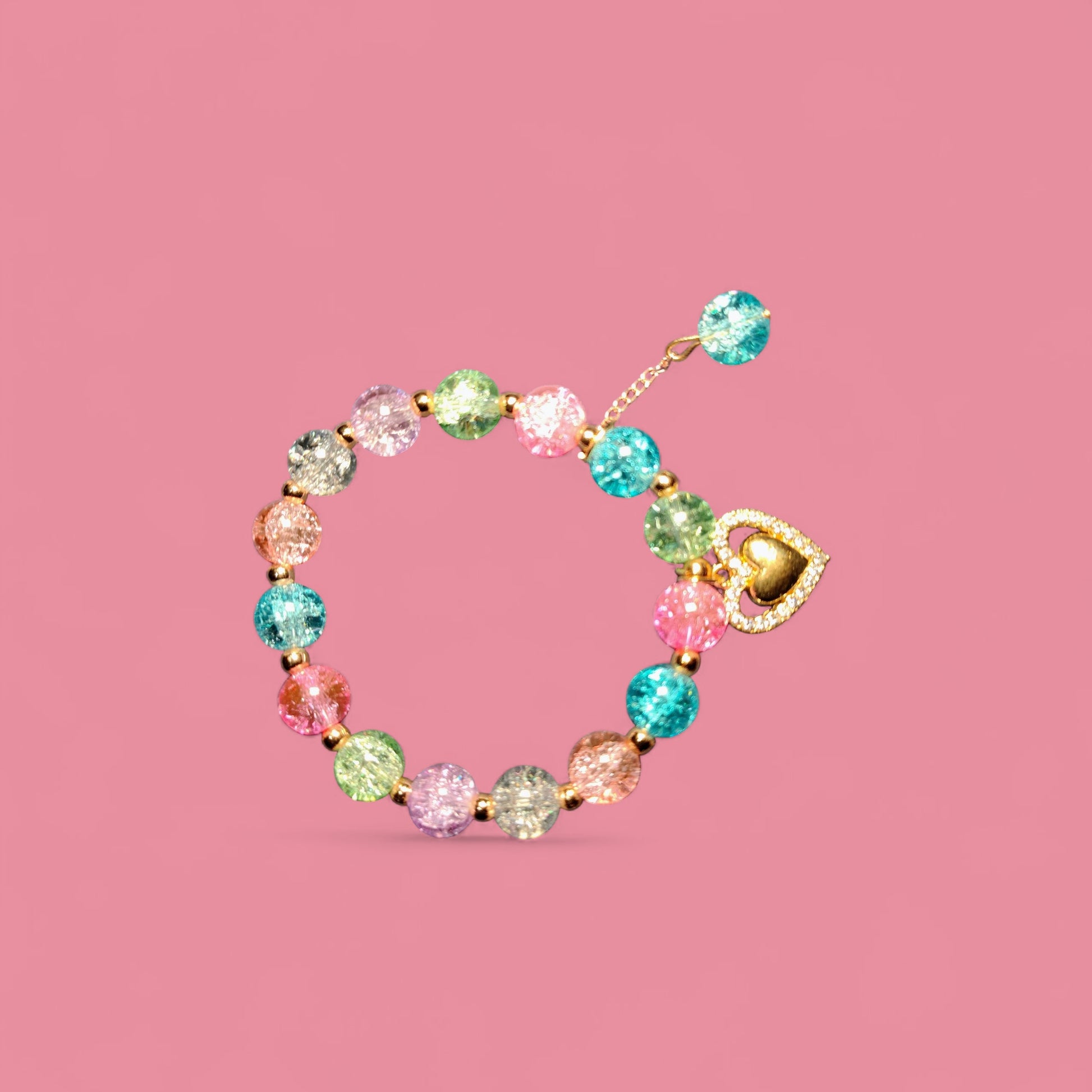 Made with multicolor crackle glass beads, this bracelet sparkles under light and adds a sweet gold diamond heart charm at the center — symbolizing love & elegance.